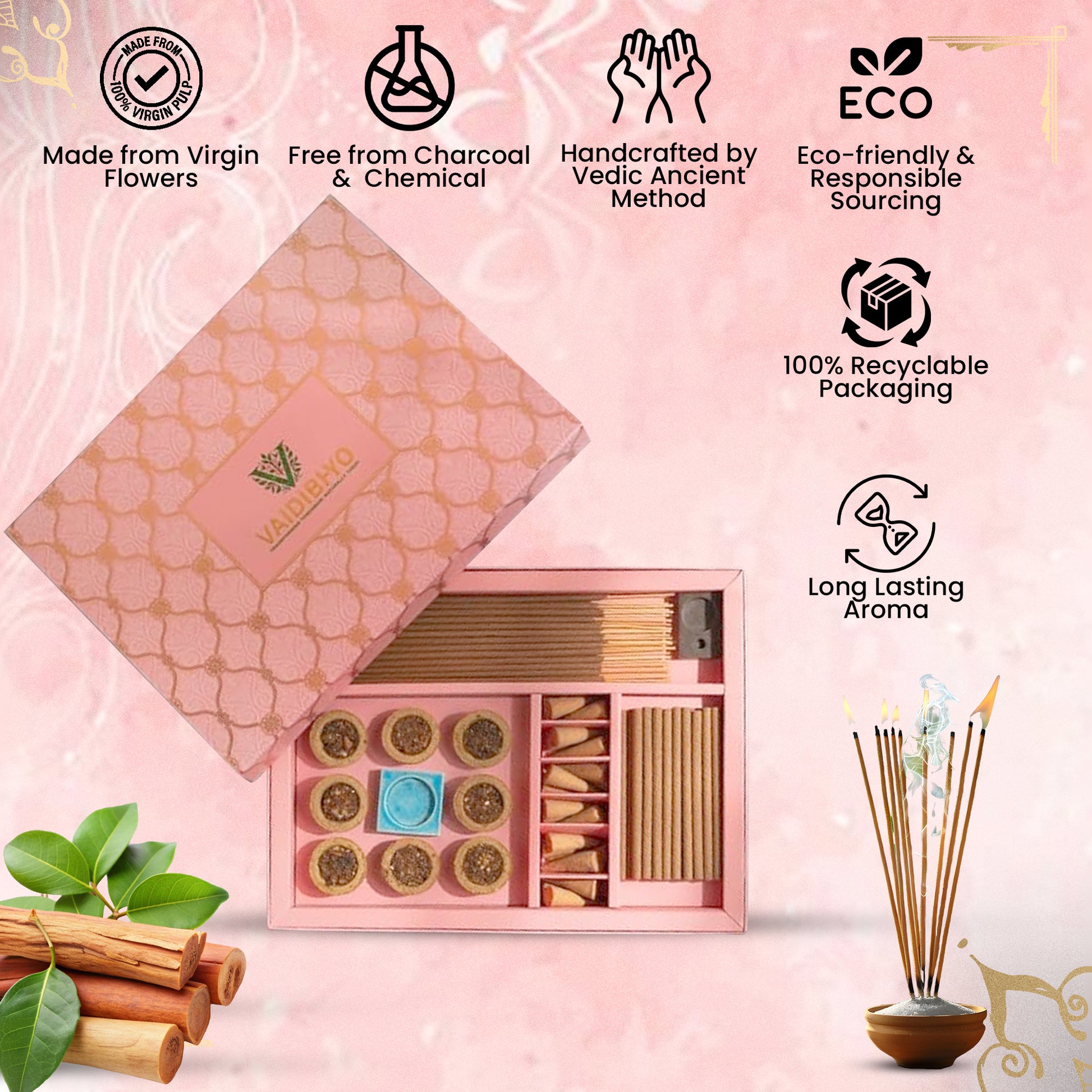 Vaidibhyo® Luxury Incense Mixed Products Pack of Jasmine (30 Agarbatti, 15 Dhoop, 30 Cones) | Guggul 8 Havan Cups | Herbal | Refreshing Aromas | Eco-Friendly Packaging | 3 Free Stands