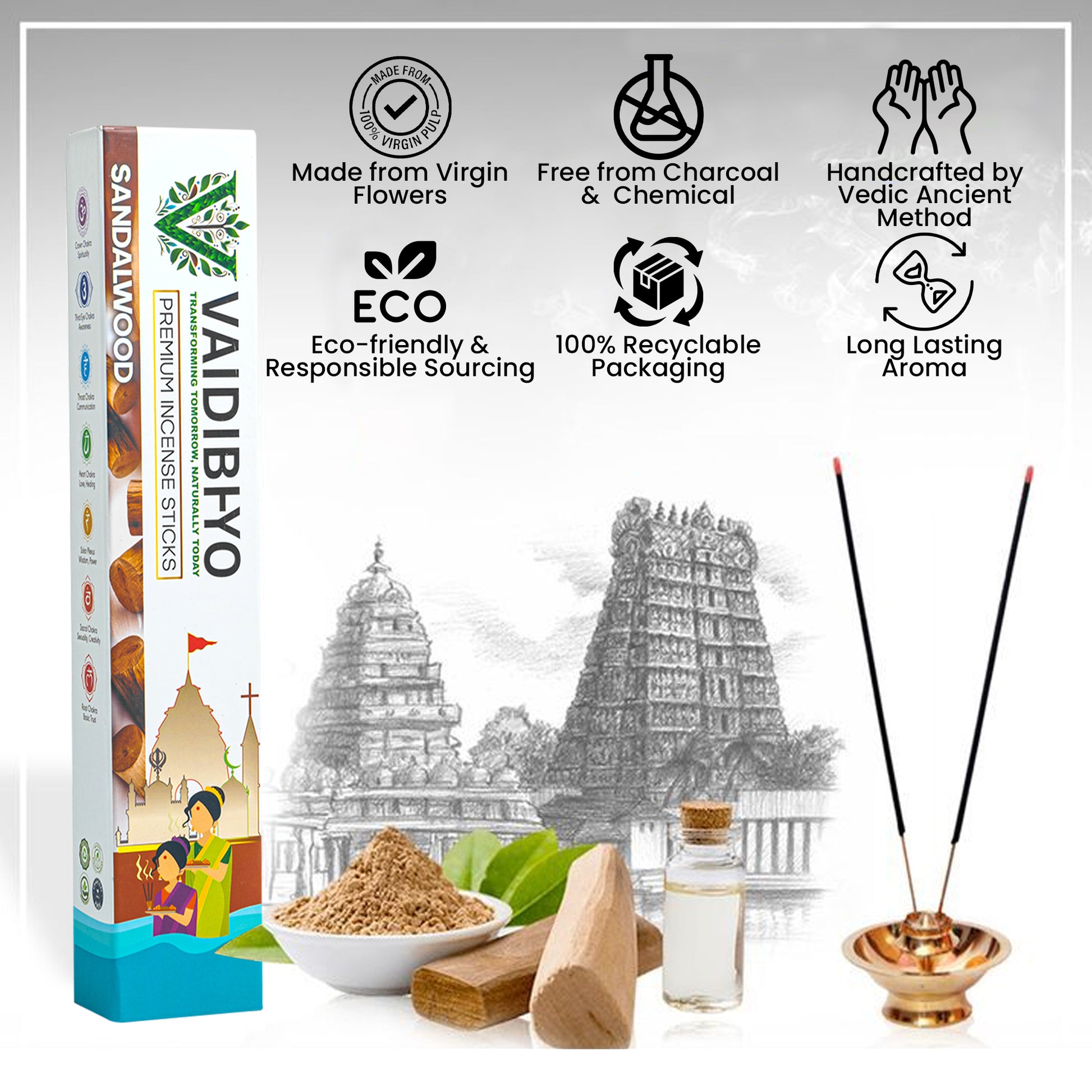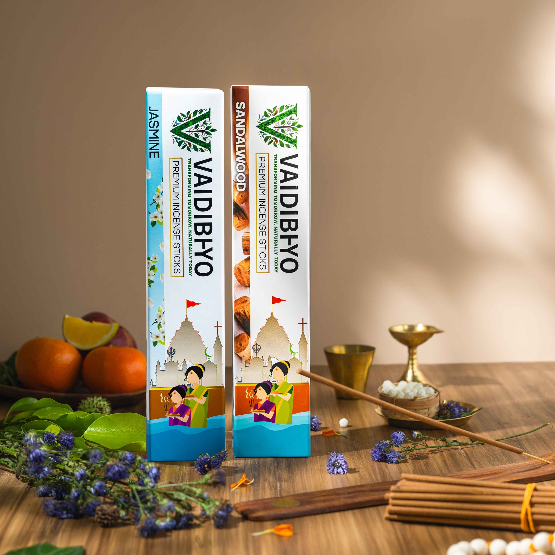 Vaidibhyo® Luxury Incense Sticks | Sandalwood & Jasmine | Combo Pack of 2 | 40 Agarbatti Sticks in Each Packet | Herbal | Perfect for Outdoor Use | Eco-Friendly Packaging | 2 Free Stands Inside