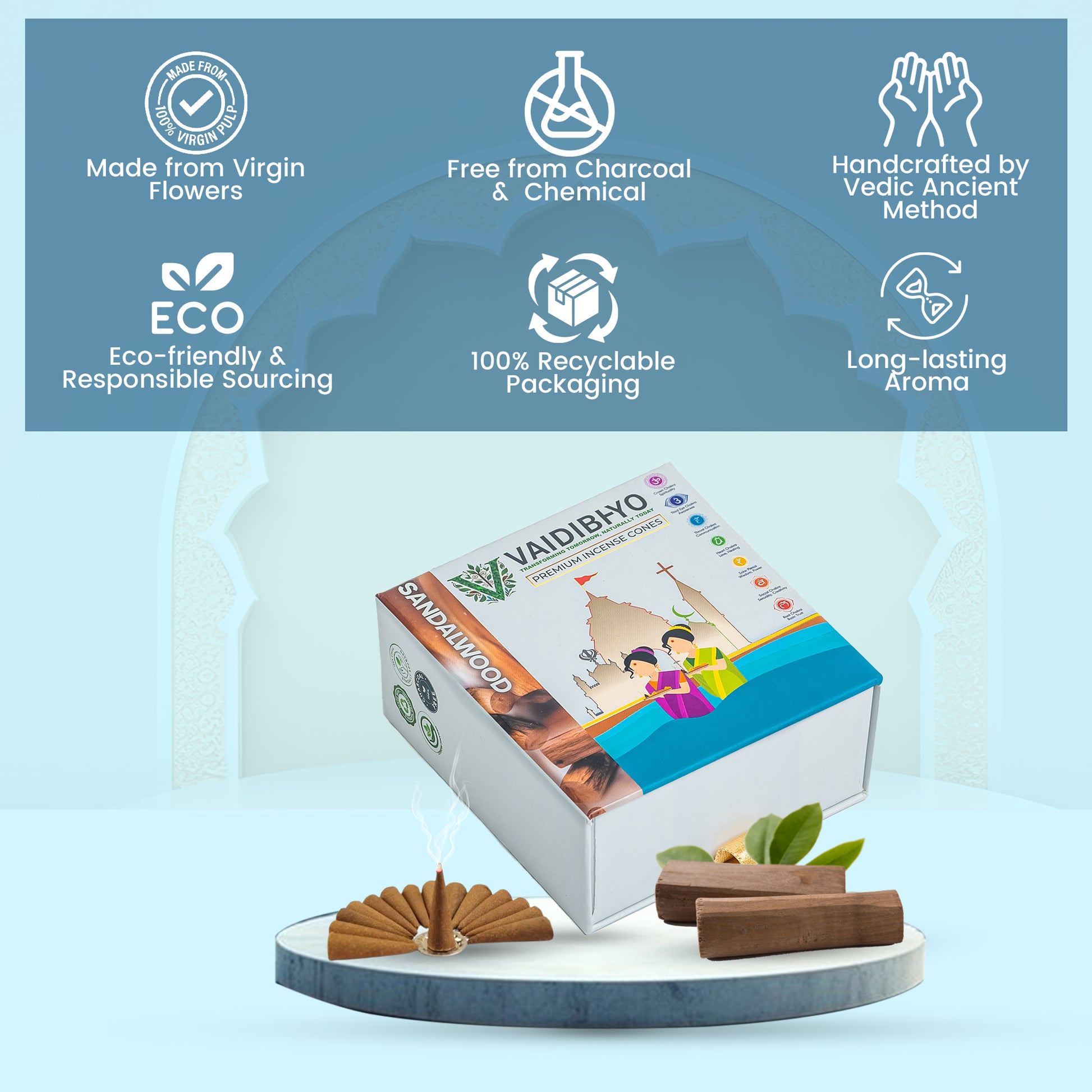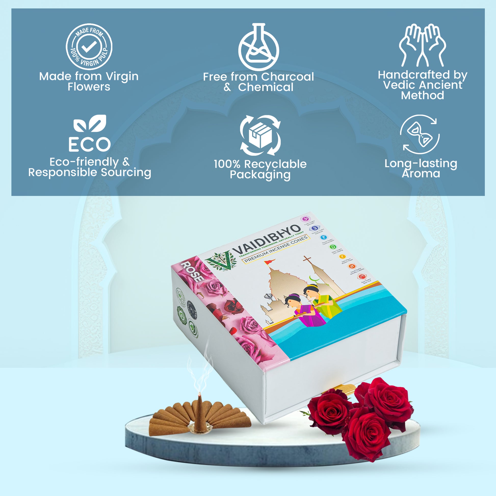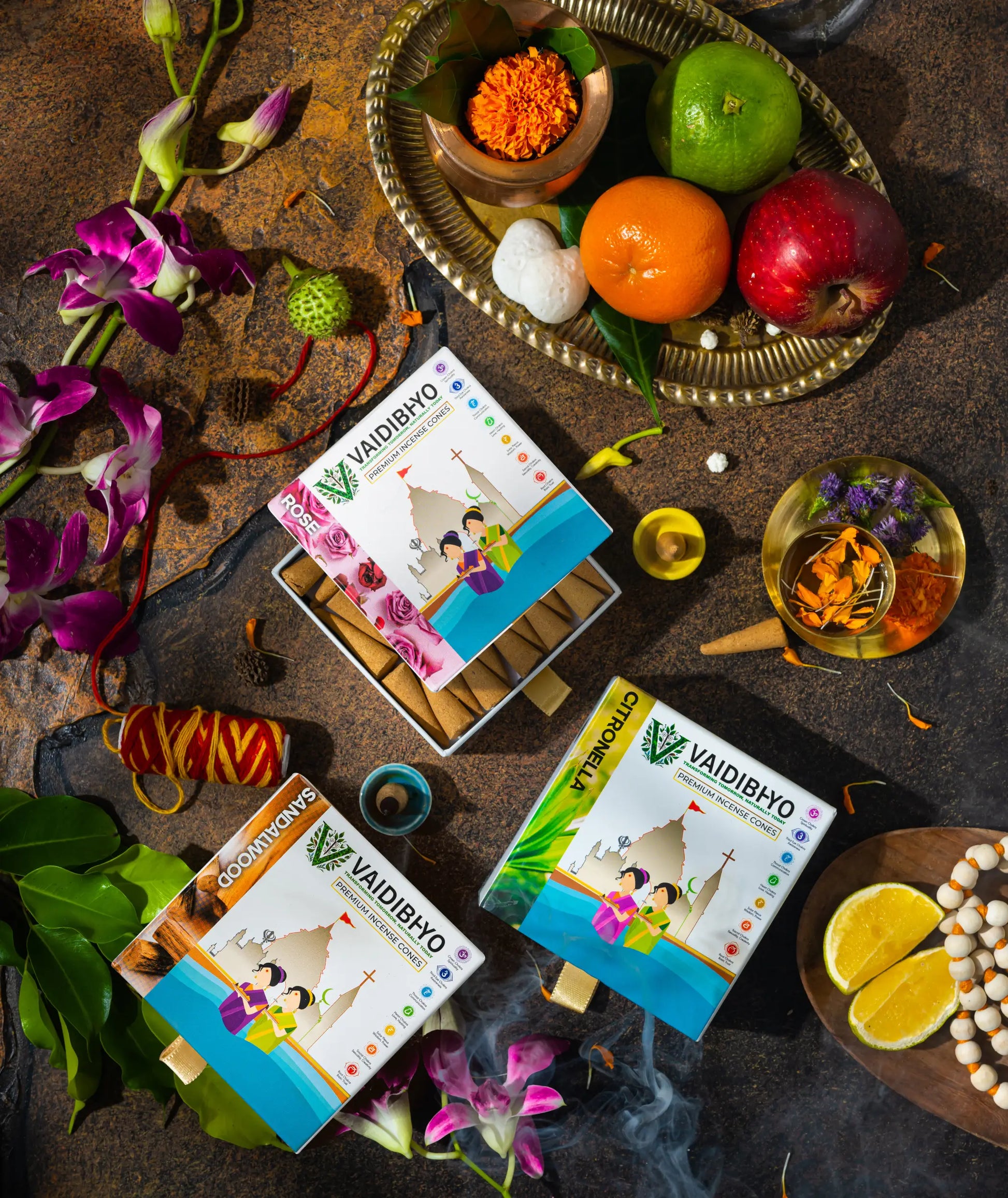 Vaidibhyo® Luxury Incense Cones| Sandalwood, Rose & Citronella | Combo Pack of 3 | 40 Dhoop Cones in Each Packet | Herbal | Perfect for Outdoor Use | Eco-Friendly Packaging | 3 Free Stands Inside